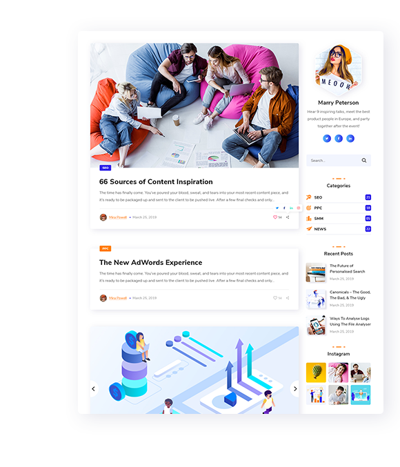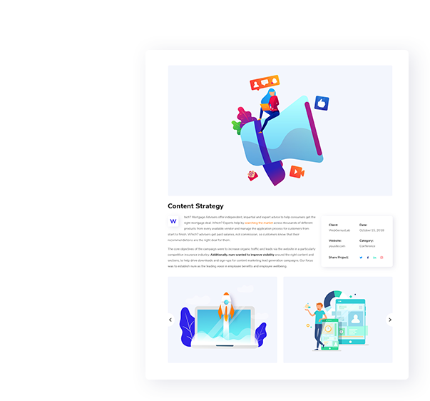 Show your gorgeous projects using our portfolio, which includes different styles like: gride, masonry. Masonry layout allows displaying projects as a fancy column-based. Grid is a perfect solution in case you need to display projects in columns.